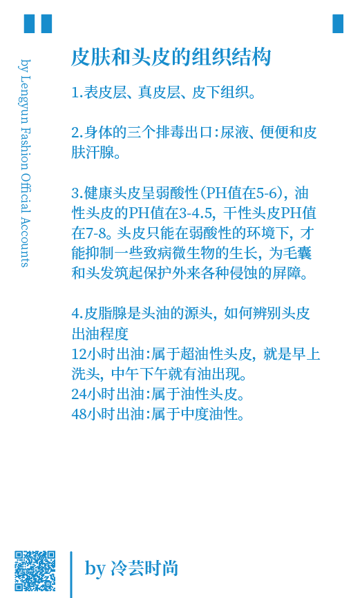 皮肤的代谢周期是28天,头皮的新陈代谢为14-21天。头皮的老化速度是脸部皮肤的6倍,身体皮肤的12倍,当头皮有一条皱纹的时候,脸部就会有六条皱纹。每个毛囊链接着300根微细血管,大脑所有的养份都由微细血管供应。所以,当头皮不健康的时候,就会出现头疼,头晕,皮头痛,脱发,头皮衰老等症状。头皮50天的出油量50克:面部皮肤爱出油?那你是低估了头皮出油的能力。头皮分泌的油脂是额头的两倍以上。科学实验表明,头皮每天的出油量在1克左右。50天的出油量可以装满一罐容量50克的面霜。