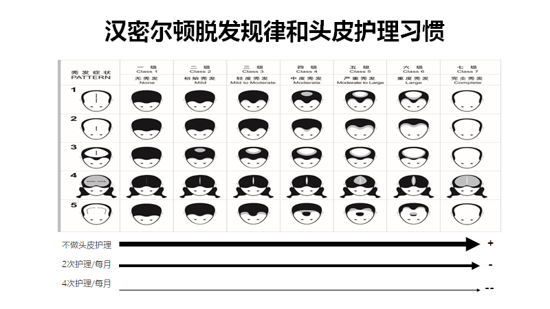 大家请看下面这张汉密尔顿脱发指数和头皮护理习惯的对比表格:二、三级脱发是早期脱发,可以通过每周2次的专业头皮护理,使用专业的头皮护理产品,一般情况下,三到四周左右就会初见成效;四级脱发需要结合定期的头皮护理和物理增发同步进行,效果会比较明显;六级脱发一般都采取增发补发业务,也有部分人等不及需要采取植发来解决,但是植发不仅成本高,技术的参差不齐会导师植发过后的效果千差万别。七级脱发是因为顾客生理因素导致的全秃或者化疗导致的脱发,如果顾客不拒绝戴假发会是一个很快速很好的解决方案。虽然说脱发是一种生理现象,随着人的年龄的增长而加重,但是良好的头皮护理,却可以减缓脱发甚至是迟滞脱发,让你显得比同龄人更年轻。