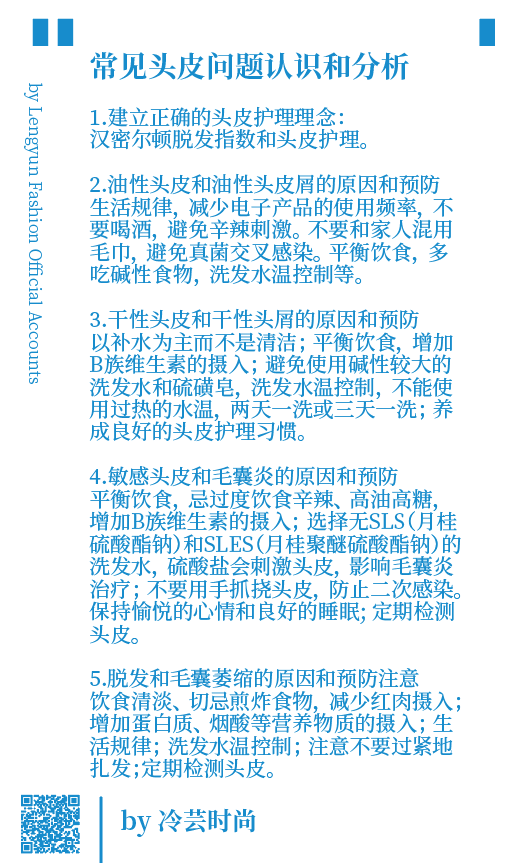 到这里我已经给大家分享了油性头皮和油性头屑、干性头皮和干性头屑、敏感头皮和毛囊炎、脱发和毛囊萎缩四种常见头皮问题的原因和预防,希望对大家有帮助。