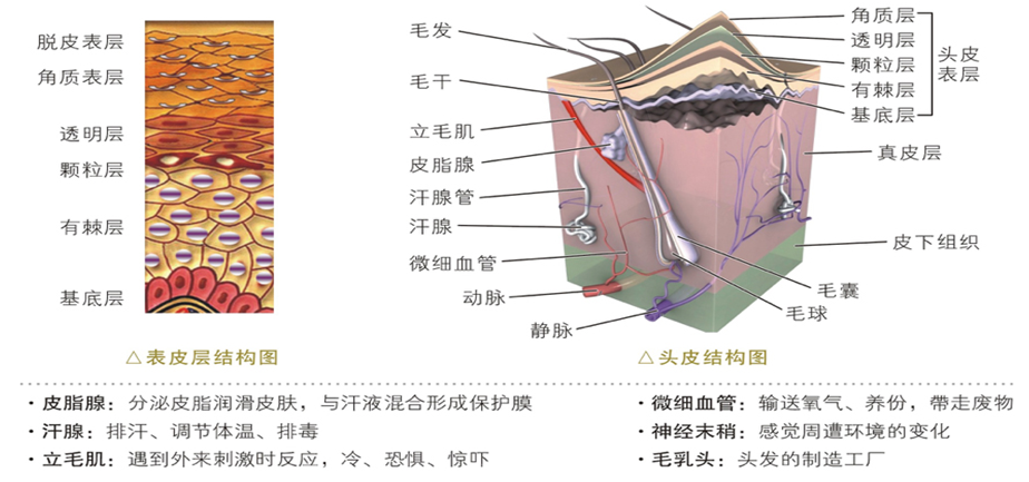 (3)头皮通过汗腺和皮脂腺完成体温调节、代谢分泌和排泄、免疫功能。