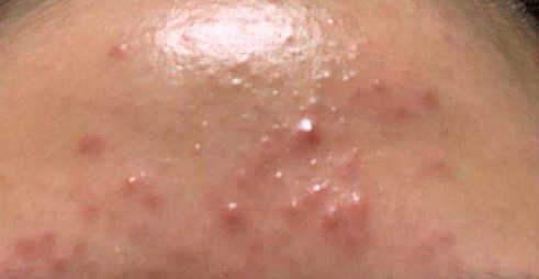 我们一边唏嘘一边仔细查看了小可爱的照片,发现她的额头爆发的全是内含白色分泌物的痘。