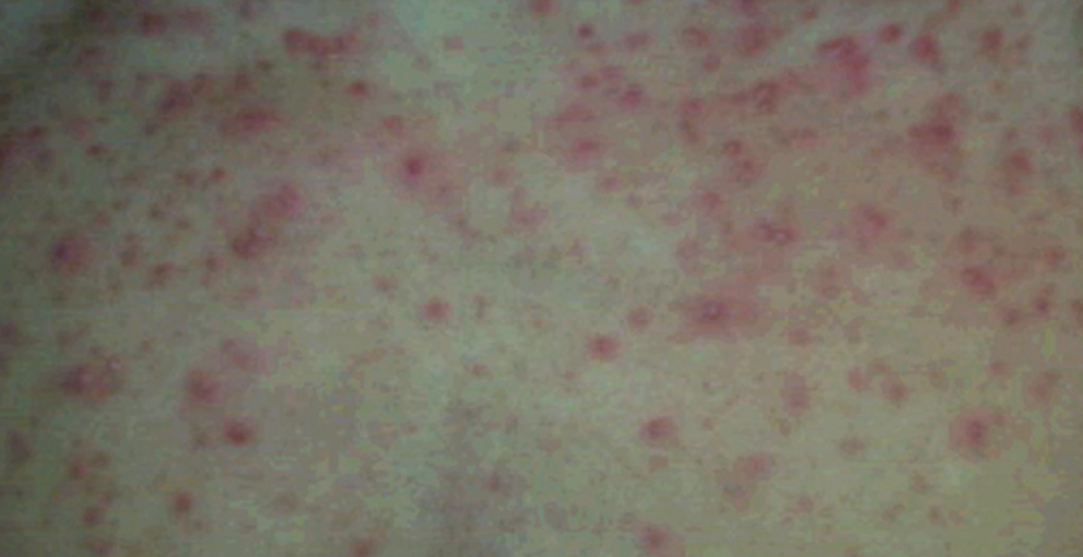 - 毛囊周围出现红色丘疹,皮疹中央可见到毛发贯穿;