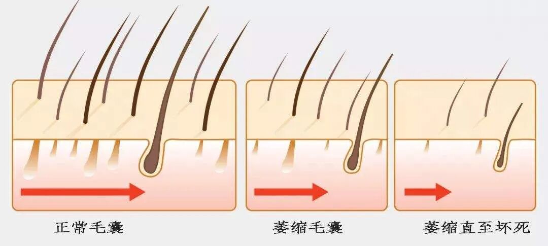 我们认为萎缩的毛囊是可挽救的毛囊,因为它仍然具有生命力。但当自体正常代谢紊乱、各种生命元素失衡的时候,就像严重营养不良的人一样,若不及时给予针对性的治疗,最后慢慢会因为器官衰竭而失去生命。