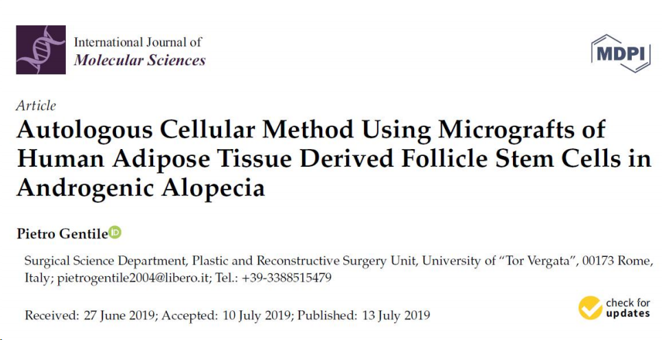 [6]Gentile P. Autologous Cellular Method Using Micrografts of Human Adipose Tissue Derived Follicle Stem Cells in Androgenic Alopecia. Int J Mol Sci. 2019;20(14):3446.