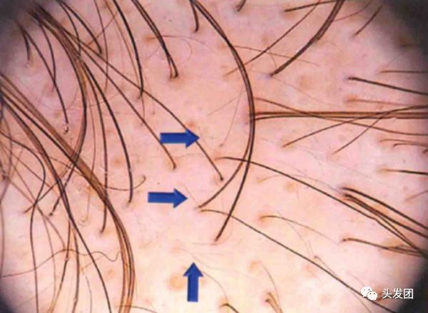 雄激素脱发粗壮头发退化成寒毛(蓝色箭头)