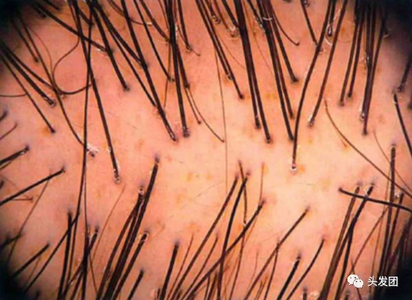 正常人的毛囊会生长出1-3根头发。平均来看每个毛囊生长2.4根头发,且单一毛发毛囊单位的比例小于30%。但在雄脱发友中,毛囊单一毛发情况的比例会显著上升。本图是雄脱发友头皮局部,可以看到绝大多数毛囊只长出了一根头发。