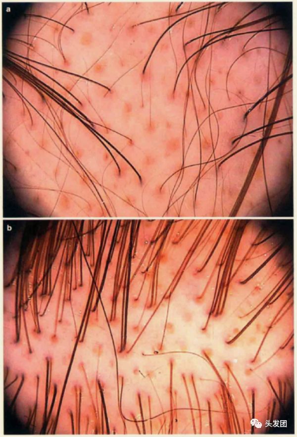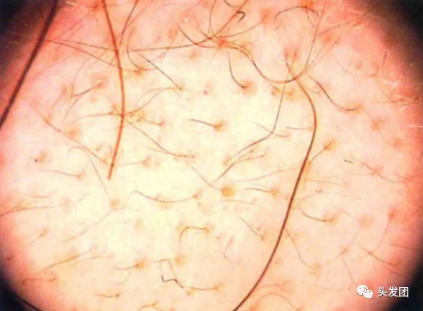 前额部(图a)可以明显看到,头发的直径在逐渐变细变小,正在逐渐退化成寒毛。绝大多数毛囊只包含一根头发。可见黄点症。