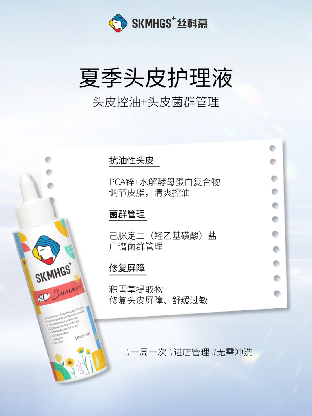 【丝科慕夏季头皮护理液】中也是除了含有调节油脂的成分之外,还含有多种溶菌抑菌的成分,如溶菌酶、1,2-己二醇和己脒定二盐等,它们可以深入到头皮微生态环境中,抑制头皮菌群的繁殖,促进头皮菌群平衡,从而打造一个健康的头皮环境,防止头皮毛囊炎发生。