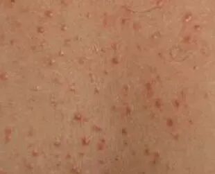 糠秕孢子菌毛囊炎(又称马拉色菌毛囊炎)。马拉色菌本来是毛囊中的正常菌群,一般不会致病,但在一些特殊诱发因素作用下会过度增殖引发真菌性毛囊炎,表现为半球形的丘疹,不出脓、不痒不痛。
