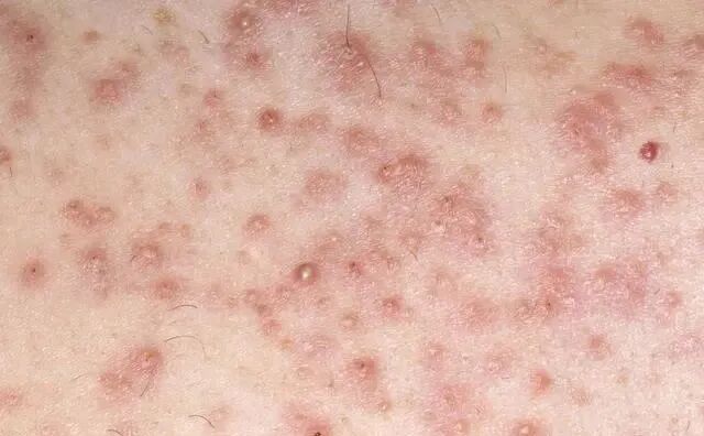 主要是毛囊细菌感染发生化脓性炎症,初起时多为成簇分布的细小丘疹,之后在丘疹顶端出现针头大的脓疱,这些小脓疱会很快的破损、流脓、结痂,但在这个过程中又会有新的丘疹出现,继续重复之前的现象。好发于头皮、面部、小腿、阴部、脖颈、腹部等;另外,毛囊炎常伴有剧烈的瘙痒情况。