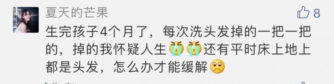 其实,除了刘女士,所有产后妈妈貌似都在面临着产后大量脱发的问题。上次就有一位仙女在小九评论里留言: