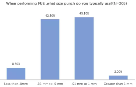 所以植发器械的直径需要一个理想值,既不能创伤过大,又不能损伤毛囊。这个理想值是多少呢?就是上图的结果,全球有将近90% 的植发医生认为0.8~1.0mm 是平衡植发效果的最佳值。如果下次你们看到植发机构包装自己技术的精密程度,甚至推出0.6mm、0.4mm 直径的技术时,只要笑笑就好,可能这些植发机构描述的,是一种针灸的手法。