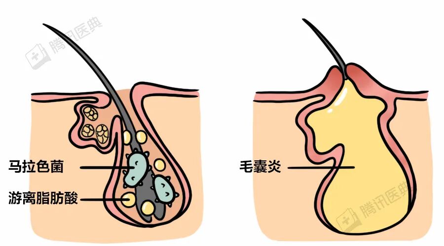 这时候,马拉色菌就能可劲儿吃、可劲儿生,从而形成毛囊炎。