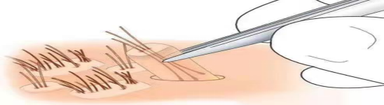 提取后毛囊的拔取,在从头皮表面拔出毛囊时,对皮肤层及皮肤上层的毛干位置进行轻柔,持续的牵引动作,拔出毛囊,在提取过程中仍有可能存在毛囊单位与深部结缔组织粘连紧密乃至脱鞘的情况,故应避免暴力拔取。