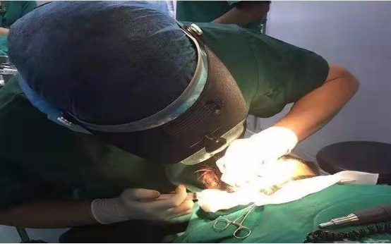 顺应毛囊角度提取毛囊,在5度的偏差内对齐皮下不可见的毛发生长角度进行冲压钻取,术中注意定期检查获取的移植体是否有横断,脱鞘情况。另外,在钻取毛囊前,肿胀液的注射非常重要,应尽量注射在表皮层下,真皮层内,手指按压有紧绷感即可,肿胀液注射过深会导致出血过多并影响毛囊提取速度。