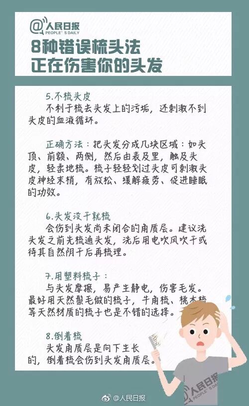 平时,也可以用手按摩头皮,用保健梳梳头发,不仅可以促进头皮的血液循环,又能将头发上附着的尘垢刷掉,有利于生发、固发和增加头发的光泽。