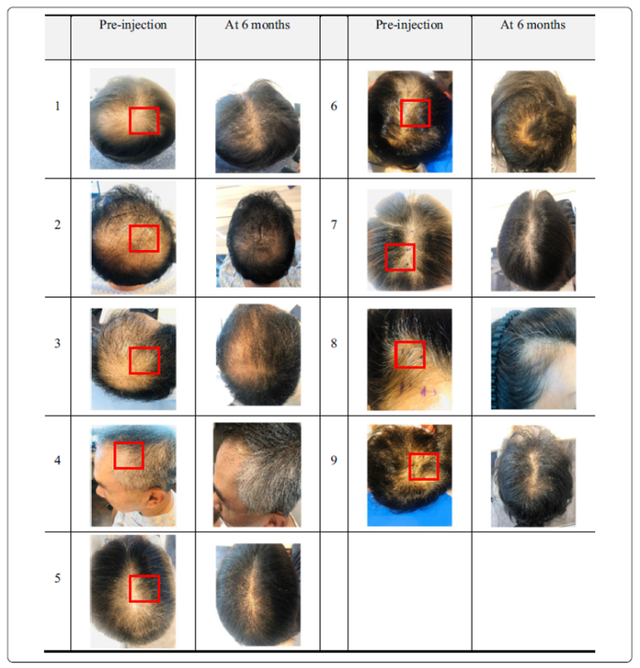 2021年,来自韩国科学家的一项相关研究,结果显示,在9例脱发患者中,均观察到脱发患者经治疗后,头发数量增多,脱发改善的情况。