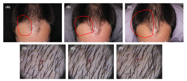 在一例34岁的男性脱发者中,脱发时间长达7、8年,经一段时间治疗后,检查结果也提示其毛发数量相较治疗前增多。