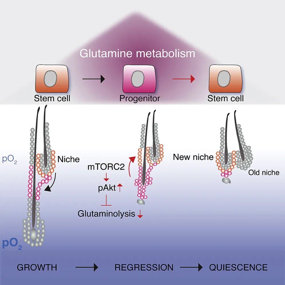 毛囊干细胞可以通过响应组织中的低氧浓度而切换其代谢状态(由谷氨酰胺代谢转变为糖酵解代谢),增强外根鞘祖细胞向毛囊干细胞转化,减少毛囊干细胞的消耗。
