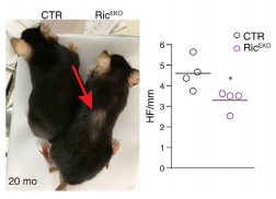 为了评估 mTORC2 在 HFSC 中的作用,研究者通过构建 Rictor 敲除小鼠,研究观察到缺少 Rictor 的小鼠的毛囊再生和循环明显延迟,HFSC 含量降低,且该突变型小鼠随着年龄增大表现出 HFSCs 的耗尽和年龄诱导性脱发。