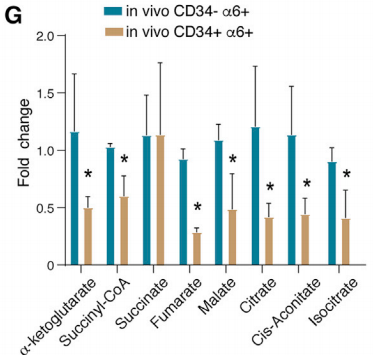 通过转录组分析发现,ORS 祖细胞中参与线粒体 ATP 合成和 OXPHOS 的相关基因高度表达,通过液相色谱 - 质谱 (LC-MS) 对关键代谢中间产物进行定量分析发现,TCA 循环中的代谢产物也明显增加,而 HFSC 中的线粒体明显较少,且线粒体相关基因的表达水平也较低。