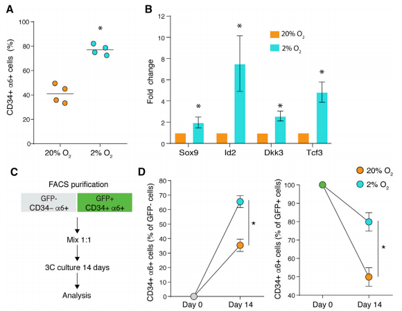 研究发现,培养后进行荧光激活细胞分选(FACS)纯化的 CD34 + /α6 + 细胞在集落形成试验中的增殖潜力高于培养的 CD34- /α6 + 细胞。
