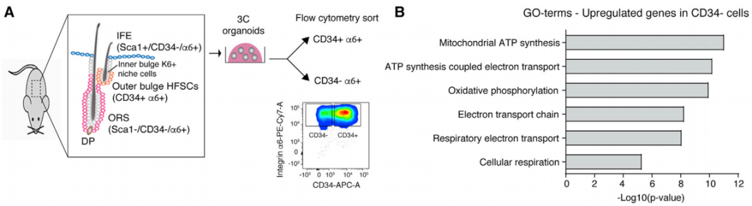 研究者为了解 HFSC 的调控机制,研究人员检测了 HFSC 及 ORS 祖细胞这两种细胞群体的转录组和代谢谱。