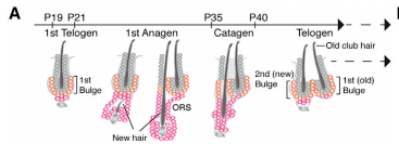 当毛发开始生长时,毛囊干细胞被激活产生祖细胞,随后分化为其子细胞(毛囊外根鞘细胞,Outer root sheath,ORS)以提供细胞毛囊生长所需的营养,而当毛发生长处于退行期时,部分外根鞘前体细胞会去分化形成新的毛囊干细胞。而目前对两者细胞形态的转换机制知之甚少。
