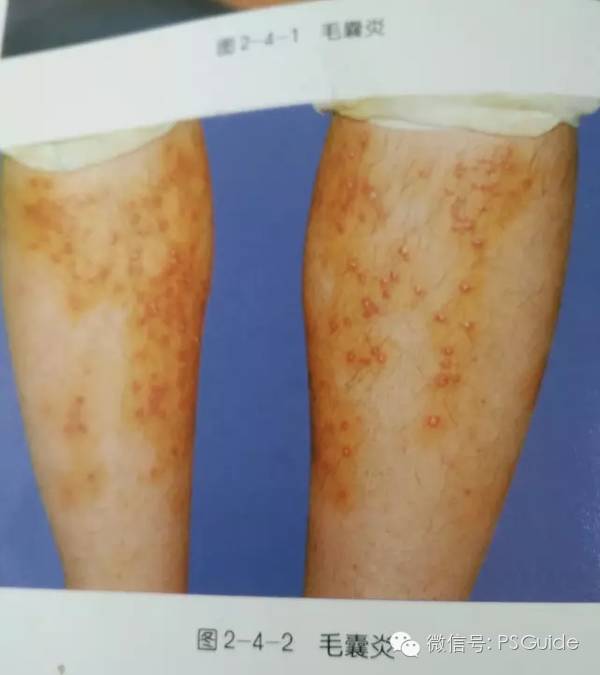 初起为红色充实性丘疹,以后迅速发展演变成丘疹性脓疱,中间贯穿毛发,四周红晕有炎症,继而干燥结痂,约经1周痂脱而愈,但也有反复发作,多年不愈,有的也可发展为深在的感染,形成疖、痈等,一般不留瘢痕。皮疹数目较多,孤立散在,自觉轻度疼痛。在成人主要发生于多毛的部位,在小儿则好发于头部,其皮疹有时可互相融合,愈后可留有小片状秃发斑。