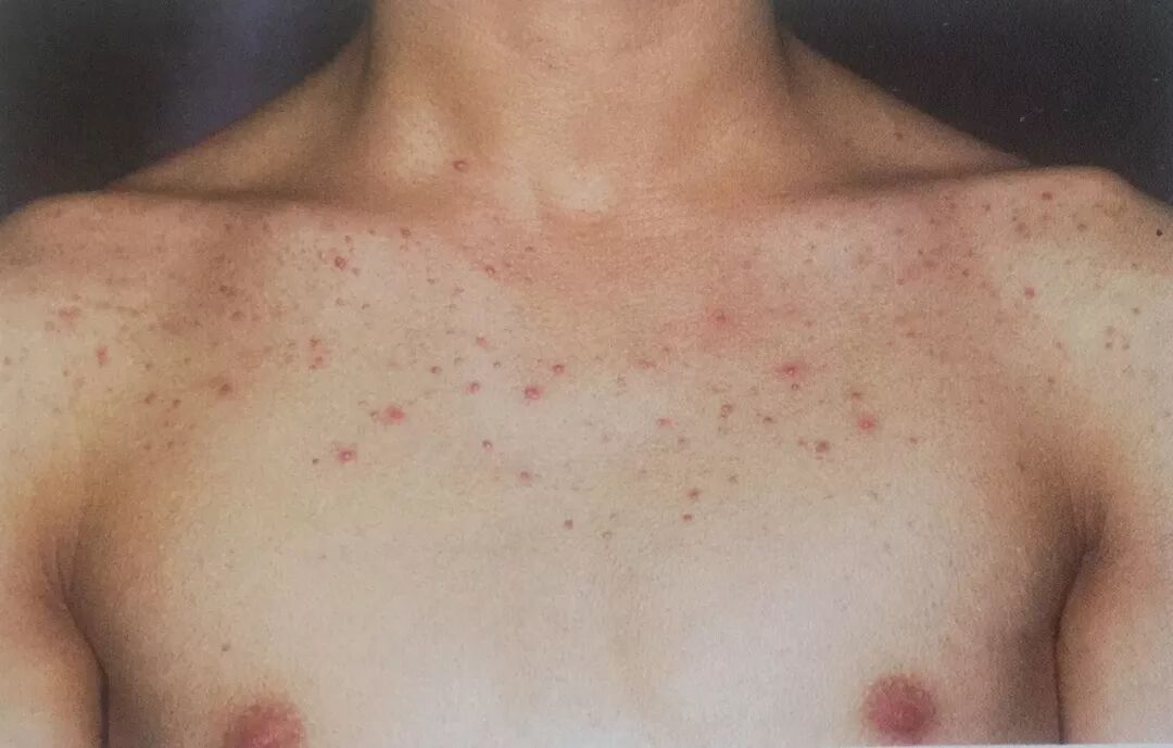 一般发病于胸部、颈部、面部、肩部、背部、和上肢!青年的患者经常被误诊为寻常的痤疮。