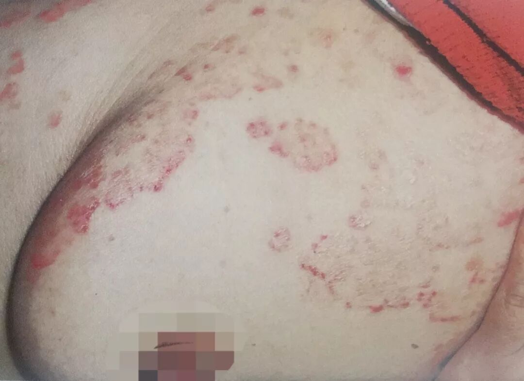 【嗜酸性脓包性毛囊炎】一般比较少见的毛囊炎症,无菌性脓丘疹或脓疱疹,周围绕以红晕,发于面部、前胸及后背!因无菌发炎损害皮肤毛囊(所以更难治愈)以抗菌止痒为主要治疗手段