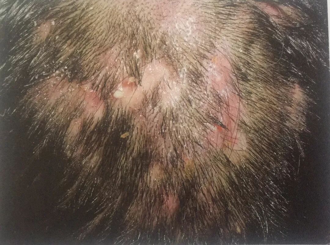 诊断要点:主要发生于头部,尤以顶、枕部多见。也可见于后背、臀部等。损害初起为毛囊和毛囊周围炎,逐渐增大形成半球形结节,结节软化后形成脓肿,破溃后成为多数瘘孔,有脓液流岀。脓肿间相互沟通,呈筛状溢脓。常一处痊愈结疤,它处又出现新皮损。瘢痕间可有互相连接的窦道。病损处毛发脱落,呈不可逆性。