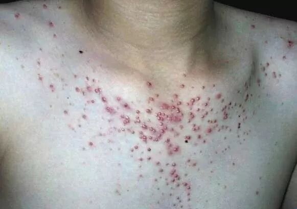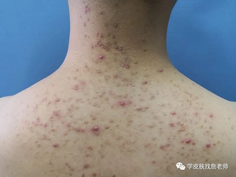 2、多见于患者的胸背、上臂、颈、肩、腰腹部位,且会散在的对称分布。