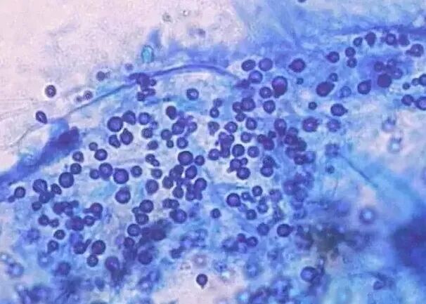 可见到圆形至卵形、厚壁、单极出芽、成簇分布的孢子。真菌镜检阳性提示本病。