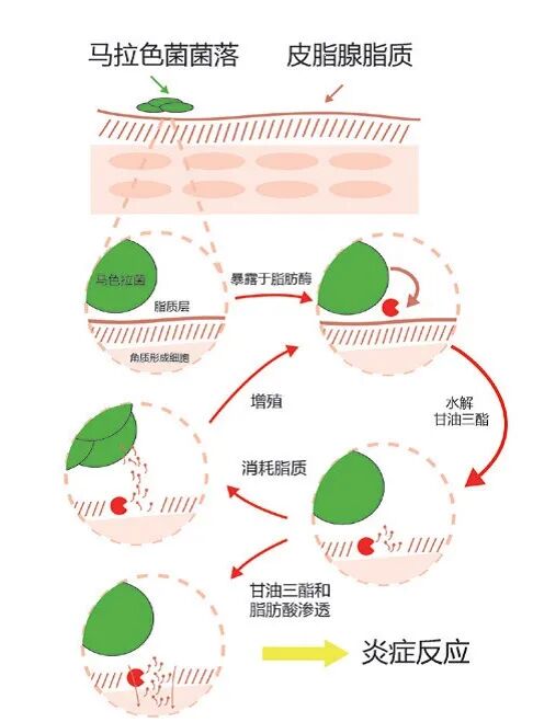 马拉色菌的脂肪分解酶可将毛囊处的甘油三酯分解为游离脂肪酸,后者可刺激毛囊口产生较多脱屑并造成毛囊口阻塞,使皮脂潴留在毛囊内无法及时排出,加之游离脂肪酸的刺激致使毛囊扩张破裂,导致毛囊内容物释放入周围组织,引发炎症反应。