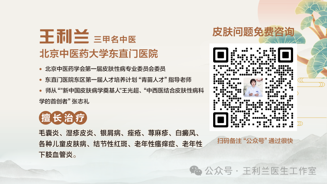大家好,我是中医王利兰,擅长用中医中药+食补的方式帮助患者解决皮肤问题。如果你有毛囊炎等皮肤问题,想要得到解决,点击下方卡片,留言即可!