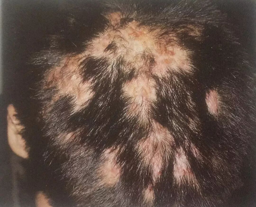 诊断要点:初起为毛囊性红斑、丘疹,后演变为脓疱,愈后留有瘢痕,瘢痕四周附近的毛囊又发生散在性大小不等的红斑、脓疱及瘢痕性秃发,以致皮损不断向四周扩大。自觉瘙痒、疼痛,多发生于青壮年男性。除发生于头皮外尚可发生于胡须部、腋毛及阴毛等处。病程慢性。