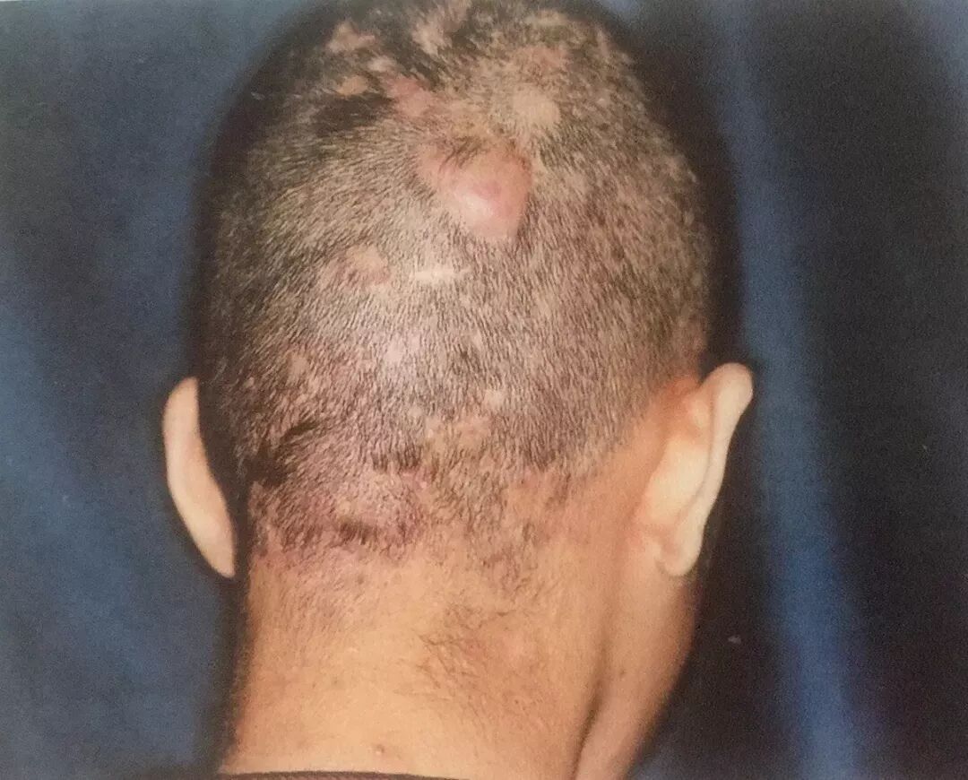 诊断要点:主要发生于头部,尤以顶、枕部多见。也可见于后背、臀部等。损害初起为毛囊和毛囊周围炎,逐渐增大形成半球形结节,结节软化后形成脓肿,破溃后成为多数瘘孔,有脓液流岀。脓肿间相互沟通,呈筛状溢脓。常一处痊愈结疤,它处又出现新皮损。瘢痕间可有互相连接的窦道。病损处毛发脱落,呈不可逆性。