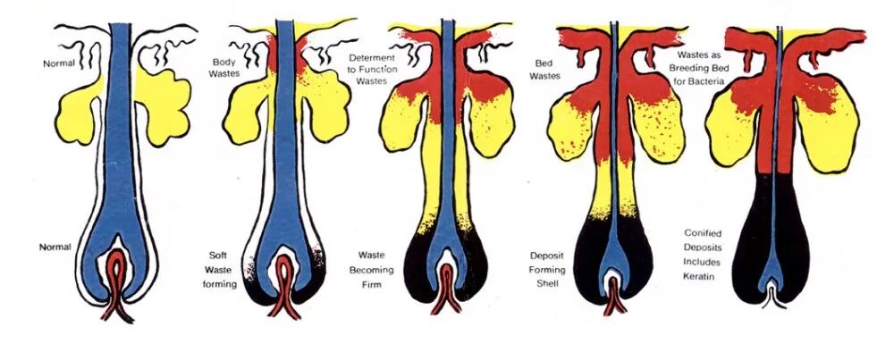 毛囊结构是一个类似U型的容器而非一个点,当我们头上油脂分泌过多,会发生油脂倒灌,进而堵塞毛孔,形成油脂粒。