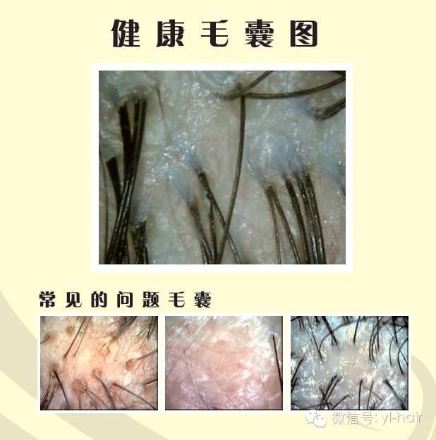 而常见的问题毛囊则多体现在油脂分泌过旺、头皮发红、毛囊口出现炎症、毛囊凹陷、毛发粗细不均匀、头屑,甚至有的毛囊因为脱发已经空了。白发的毛囊则可以清楚看到毛囊里面是没有黑色素的。