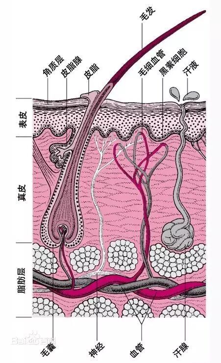 毛囊是包围在毛发根部的囊状组织,内层是上皮组织性毛囊,外层是结缔组织性毛囊,内层与表皮相连,外层则与真皮相连。