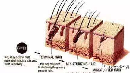 上图说的是一种叫DHT的物质使毛囊逐渐萎缩、头发逐渐变少的过程。