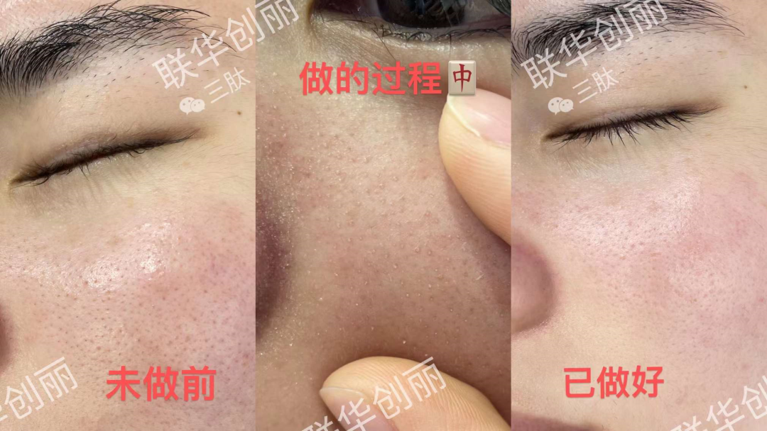 项目过程中,鼻翼两侧的粉刺、黑头冒出,这就是张开毛孔后,清除垃圾的过程;项目后,肌肤明显细腻,毛孔也缩小了