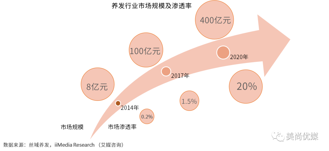 在脱发问题的影响下,养发行业开始受到关注并高速增长。2014年市场规模仅为8亿元,而2017年,市场规模达到100亿元。预计到2020年,整个养发及相关产业规模有望超过400亿元。