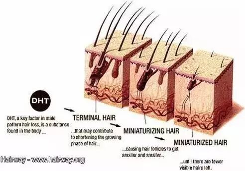 第二张图说的是一种叫DHT的物质使毛囊逐渐萎缩、头发逐渐变少的过程。