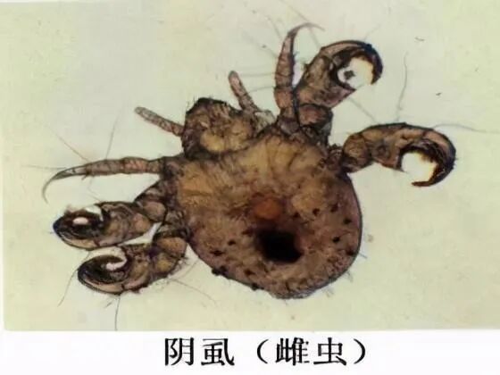 阴虱,是一种寄生并繁殖于体毛上的一种寄生虫,远看时像皮屑,近看时跟小螃蟹差不多,颜色呈棕褐色,胸腹相连,腹部短宽,身体前部分有3对足,前足比较细小,后2对足比较粗壮且有钩,能够在疏落的毛发间攀爬,主要以人类的血液为食物。