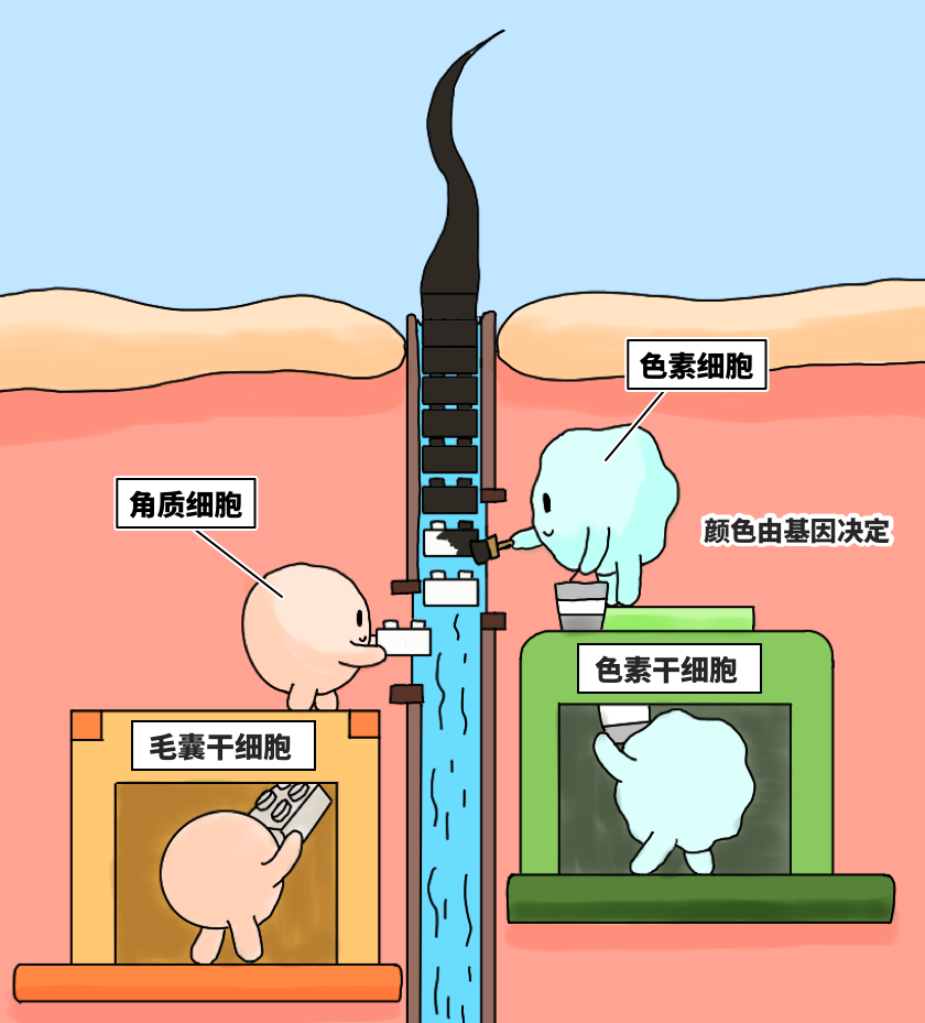 在角质细胞和色素细胞协同工作下,每天,角质细胞会生产 0.3 mm 的头发,色素细胞为这新长出来的 0.3 mm 头发刷上颜色,勤勤恳恳,日复一日,年复一年。