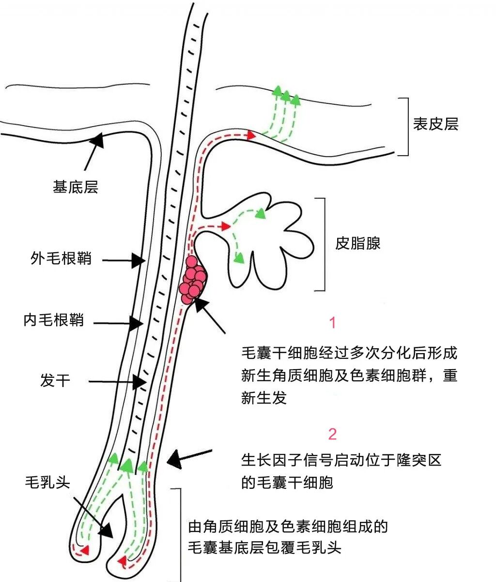 毛囊干细胞定植在毛囊隆突部位,具有干细胞的特性,包括多向分化潜能、潜在的高增殖能力和保持细胞静止的能力。在毛囊的隆突区有一个干细胞池,是角质形成细胞、黑素细胞和间质真皮细胞的干细胞库。因此,毛囊干细胞在毛囊的每一个增殖循环中都发挥重要作用。
