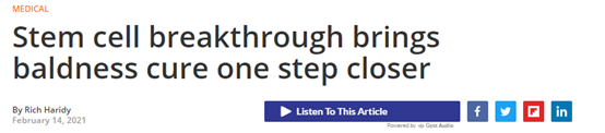 2021年3月,日本理化研究所(RIKEN)的科学家们在《自然科学报告》上发表了最新研究成果,使得干细胞在脱发上的应用更加完善。