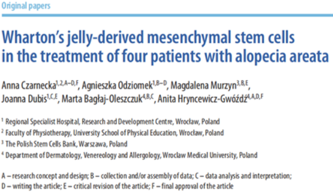 2021年,一项在波兰当地专科医院进行的人体研究,对4例平均病程长达5年的斑秃患者进行脐带间充质干细胞悬液治疗,注射部位为头皮斑秃处,治疗后所有患者均生长了头发,且完全无副作用。